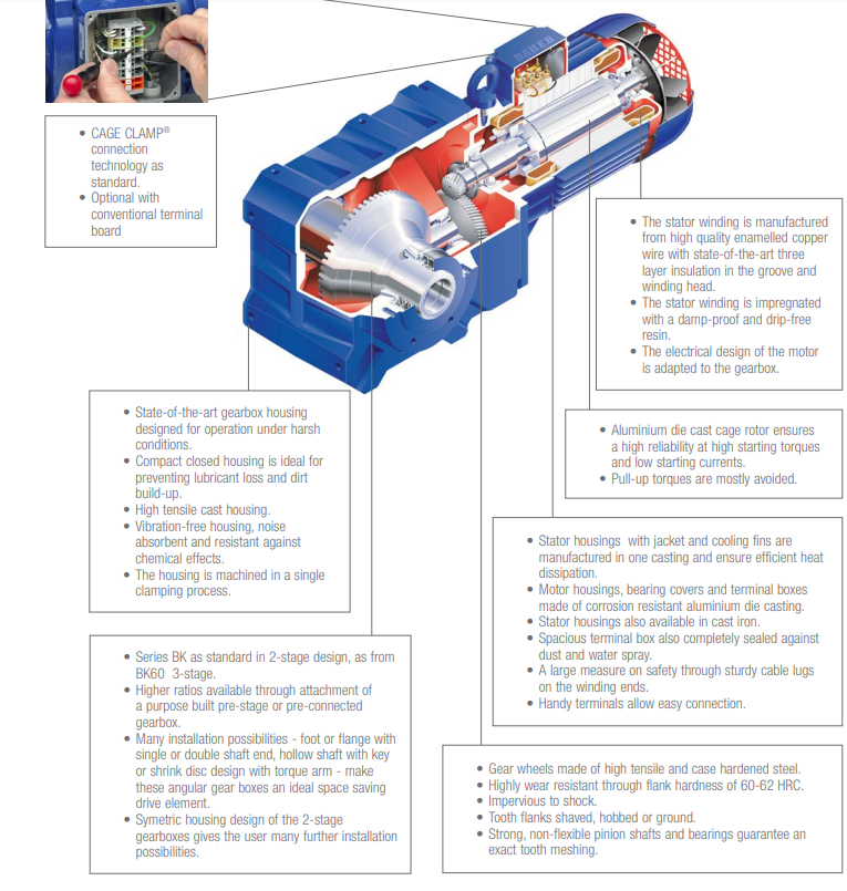 BS 減速電機(jī)是經(jīng)濟(jì)的直角渦輪減速電機(jī),可安裝在極為狹小的空間內(nèi)。經(jīng)濟(jì)劃算的直角渦輪減速電機(jī)為可靠性、效率和經(jīng)濟(jì)性樹立了新標(biāo)準(zhǔn),具備無與倫比的標(biāo)準(zhǔn)特點,如:最小尺寸的空心軸。逆變器友好型設(shè)計不僅可確保目前輕松集成,而且還能滿足未來需求。BS 減速電機(jī)擁有靈活的安裝選件,包括軸、基座、表面與法蘭解決方案。電機(jī)接線盒可以安裝在圍繞電機(jī)架旋轉(zhuǎn) 90° 的其他位置,實現(xiàn)無與倫比的集成可能性。